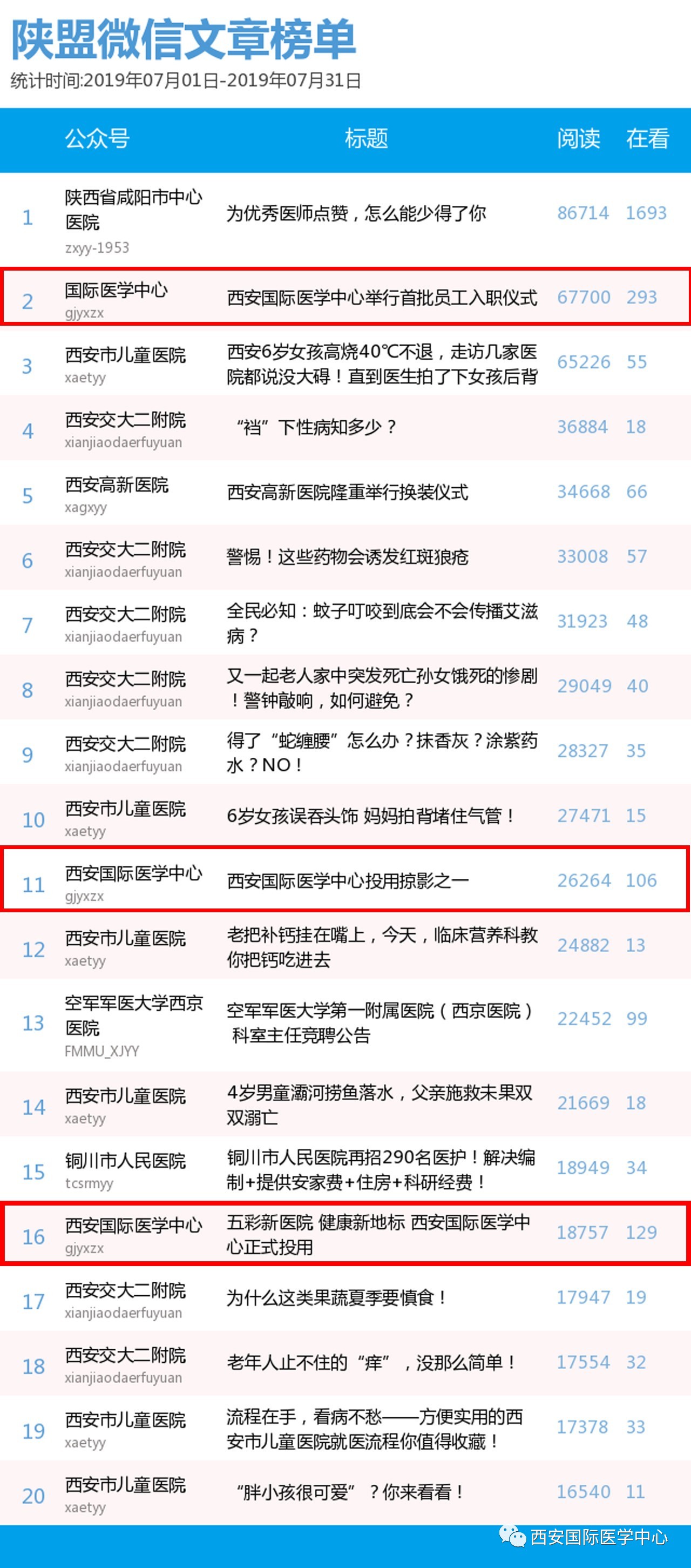 8月2日,中國醫(yī)療自媒體聯(lián)盟陜西分盟醫(yī)療機構(gòu)類微信公眾號7月份排行榜發(fā)布,西安國際醫(yī)學(xué)中心微信公眾號奪得醫(yī)療機構(gòu)類榜單第2名,高居“榜眼”。在陜西醫(yī)療自媒體聯(lián)盟的推薦下,西安國際醫(yī)學(xué)中心順利進(jìn)入今日頭條號(醫(yī)療機構(gòu)),微信文章將同步刊登到今日頭條。