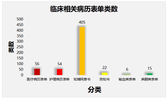 根據(jù)JCI第六版評(píng)審標(biāo)準(zhǔn),完成JCI相關(guān)醫(yī)療病歷表單類56類,JCI相關(guān)護(hù)理病歷表單54類、知情同意書(shū)405類、告知書(shū)22類、輸血類表單6類、麻醉類表單15類,總計(jì)583類。如圖所示: