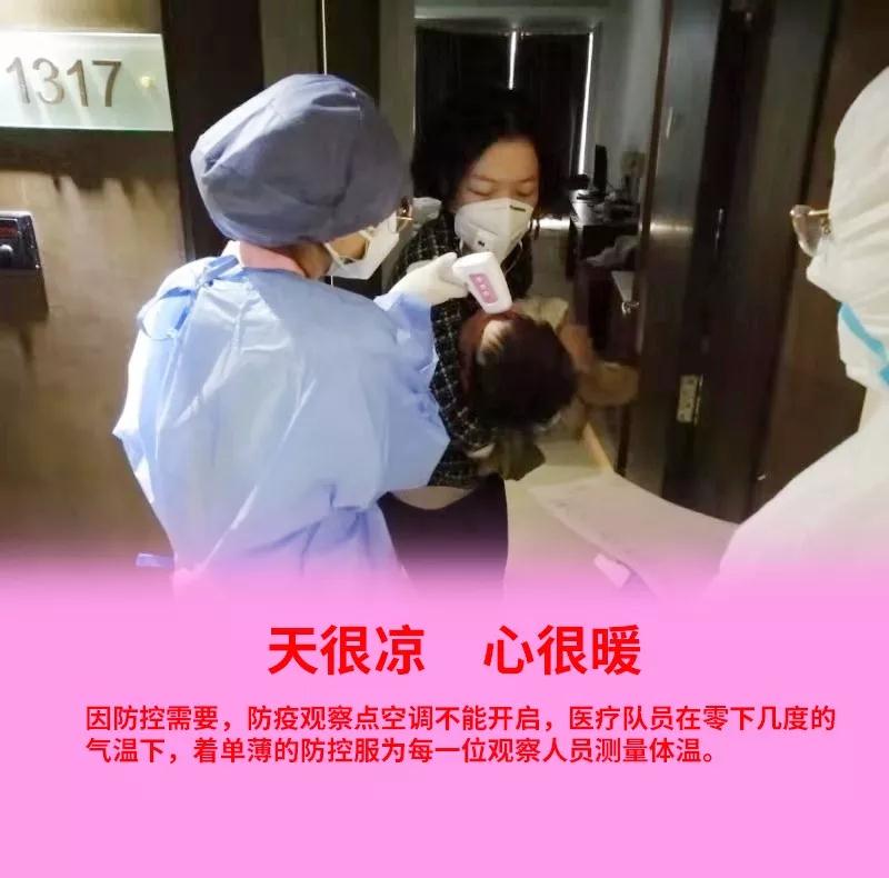 這支醫(yī)療隊(duì)由3名醫(yī)生、5名護(hù)士組成,分別是房武寧、張曉敏、王婧3位醫(yī)生;護(hù)士為白容容、陳蕓、王亞馨、燕瑞娥、田橋。身穿不透氣的防護(hù)服,醫(yī)護(hù)人員時(shí)時(shí)刻刻與時(shí)間拼耐心、與疫情變化拼細(xì)心。留觀人員中有16名70歲以上的老人,6名3歲以下的兒童。他們體質(zhì)較弱,需要更多的關(guān)懷與呵護(hù)。護(hù)士王亞馨每天要在樓上往返7、8趟為他們測(cè)體溫、安撫情緒?!拔乙矔r(shí)常想念家人,春節(jié)沒(méi)法和他們一起過(guò)年?,F(xiàn)在,這里的老人和孩子就是我的家人?!闭f(shuō)著,豆大的汗珠順著她的眼睫毛滑落。即便超負(fù)荷工作著,她也從未喊過(guò)苦叫過(guò)累。