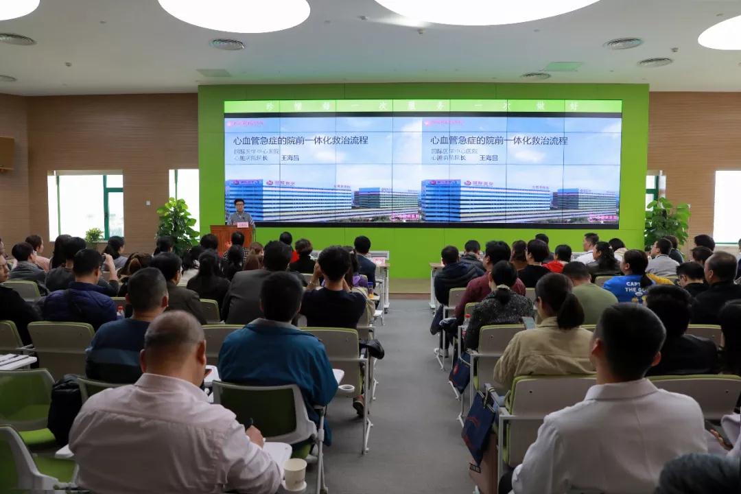 講座環(huán)節(jié),王海昌院長就《心血管急癥的院前院內(nèi)一體化救治》進(jìn)行了詳細(xì)闡述,以大量數(shù)據(jù)強(qiáng)調(diào)了心血管疾病救治過程中把握時(shí)間窗的重要性,建議根據(jù)急性冠脈綜合征突發(fā)性、不可預(yù)測(cè)的特點(diǎn),建立完善的院前、院內(nèi)急救網(wǎng)絡(luò)、胸痛中心,協(xié)助120高速有效的運(yùn)轉(zhuǎn);潘僑主任為大家介紹了心梗伴室顫猝死的院前院內(nèi)救治,分析搶救成功的心肌梗死案例,講解了發(fā)生心跳驟?;颊咧?0-95%為心源性,心源性休克首選冠脈介入診療,院前及院內(nèi)急救早期、快速并完全地開通梗死相關(guān)動(dòng)脈是改善患者預(yù)后的關(guān)鍵。