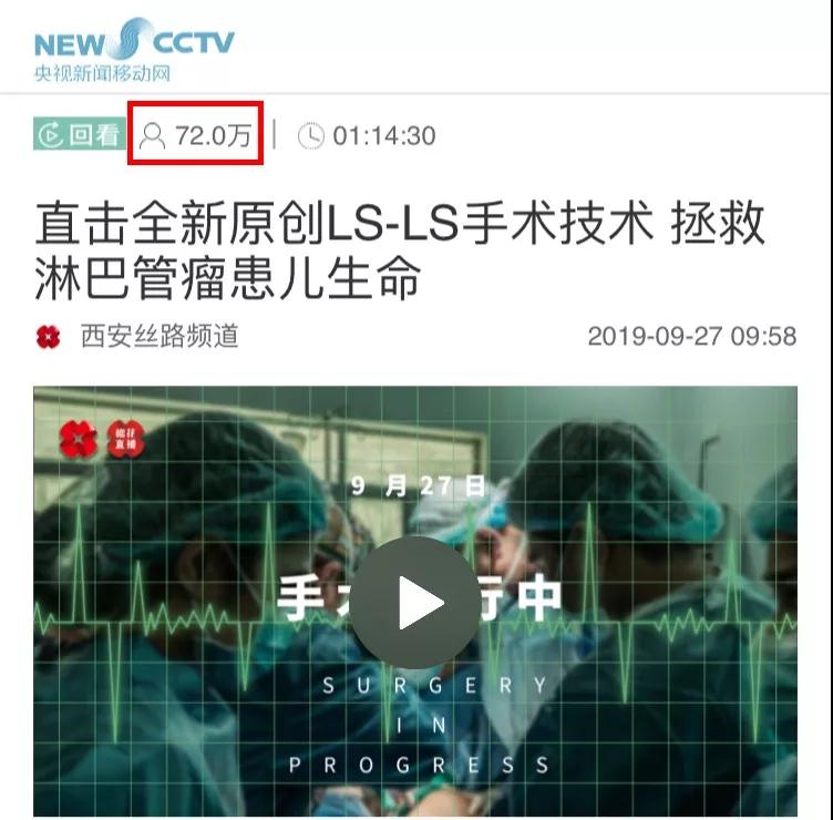 開診后的第一個手術(shù)日,西安電視臺全程直播了全新原創(chuàng)LS-LS手術(shù)技術(shù)拯救淋巴管瘤患兒生命的手術(shù)過程!央視新聞移動網(wǎng)、今日頭條客戶端、廣東廣播電視臺觸電新聞、西安網(wǎng)微博等同步播出西安國際醫(yī)學(xué)中心骨科醫(yī)院拯救淋巴管瘤患兒的全過程。據(jù)不完全統(tǒng)計,在線觀看直播達(dá)百萬,僅央視新聞移動網(wǎng)的觀看量達(dá)72萬!