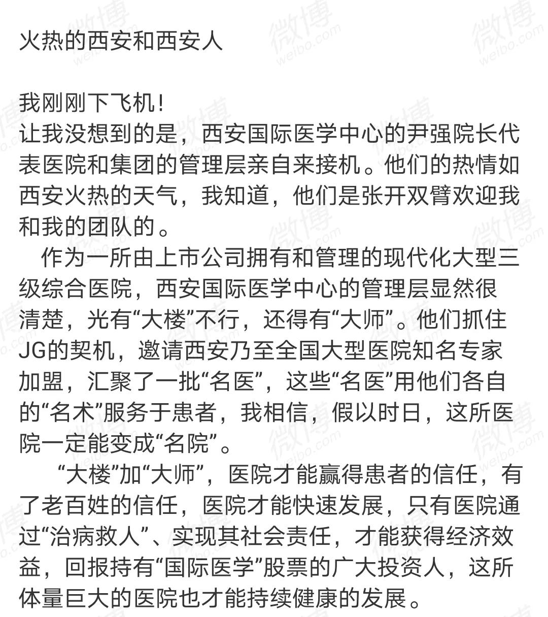 “讓我沒想到的是,西安國際醫(yī)學(xué)中心醫(yī)院的尹強(qiáng)院長代表醫(yī)院和集團(tuán)的管理層親自來接機(jī),我知道,他們是張開雙臂歡迎我和我的團(tuán)隊的?!边@是郭樹忠教授加盟該院時,在機(jī)場發(fā)布的一條微博。
