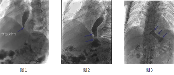 在韓國(guó)宏教授的帶領(lǐng)下,專家團(tuán)隊(duì)經(jīng)多方面評(píng)估后,決定在DSA下為劉大爺行食管造影 食管支架置入術(shù)。術(shù)中透視可見食管中上段擴(kuò)張明顯,食管下端賁門口明顯狹窄,造影劑淤積,呈線性緩慢進(jìn)入胃腔(見圖1),經(jīng)過準(zhǔn)確定位后,釋放食管支架,再次造影可見造影劑經(jīng)支架順利進(jìn)入胃腔(見圖2)。2天后再次造影見食管支架完全打開,位置正常,造影劑可順利通過支架(見圖3)。