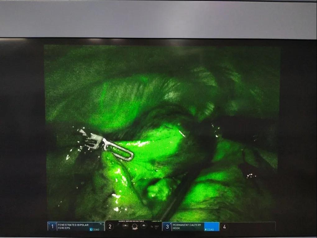 李文海主任坐在操控臺(tái)旁,操作機(jī)器人機(jī)械臂進(jìn)行胸腔內(nèi)探查,解剖肺門及肺裂,游離并閉合切斷左肺上葉尖后段血管、支氣管,清掃各組淋巴結(jié)。手術(shù)中為更加精準(zhǔn)進(jìn)行肺段切除,術(shù)前對(duì)結(jié)節(jié)及肺段血管進(jìn)行了三維重建,使得術(shù)中解剖血管及支氣管更加精準(zhǔn),術(shù)中應(yīng)用熒光染色劑對(duì)解剖平面進(jìn)行標(biāo)記,最大限度保障了正常肺段的完整及功能。