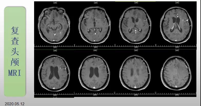 70歲的郝女士去年曾在外院查出“左額島葉”膠質(zhì)母細胞瘤(WHO Ⅳ級),并做了左側(cè)額島葉占位性病變切除術(shù)。術(shù)后進行了同步放化療。由于治療條件有限,郝女士慕名來到我院就診。賀世明主任率領(lǐng)醫(yī)護團隊立即為郝女士進行了全面的檢查,決定為其進行綜合治療 電場治療。經(jīng)過三個多月的綜合治療,患者復查頭顱MRI病變較前明顯縮小。出院時,郝女士神志清醒,睡眠飲食正常,說話很流利。“我是躺著進來的,現(xiàn)在不用人攙扶,自己就可以走出病房了。”郝女士拉著醫(yī)護人員的手說。