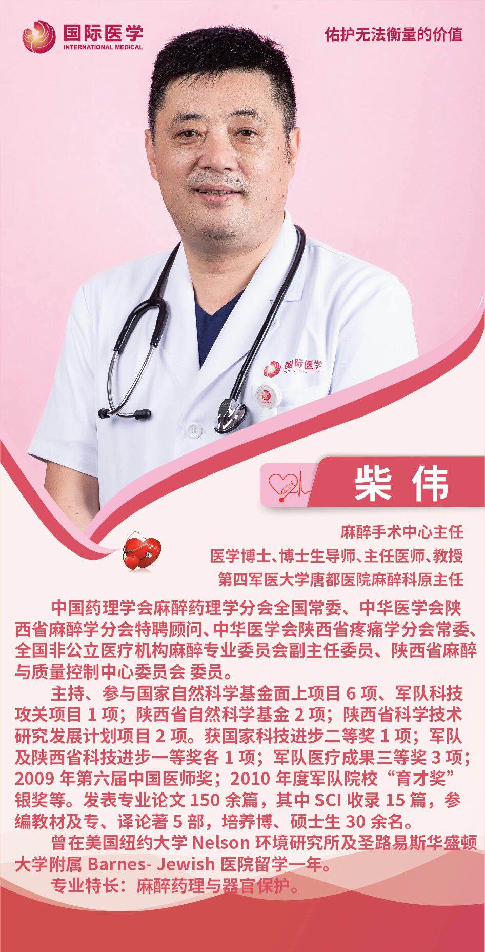 柴偉,現(xiàn)任西安國際醫(yī)學中心醫(yī)院麻醉手術中心主任,博士生導師、主任醫(yī)師、教授,第四軍醫(yī)大學唐都醫(yī)院麻醉科原主任。中國非公立醫(yī)療機構(gòu)協(xié)會麻醉專業(yè)委員會副主任委員,中國藥理學會麻醉藥理學分會常委,陜西省醫(yī)學會麻醉學分會特聘顧問,陜西省醫(yī)學會疼痛學分會常委。長期從事麻醉學的醫(yī)療、教學和科研工作,擅長麻醉藥理和圍術期器官保護。