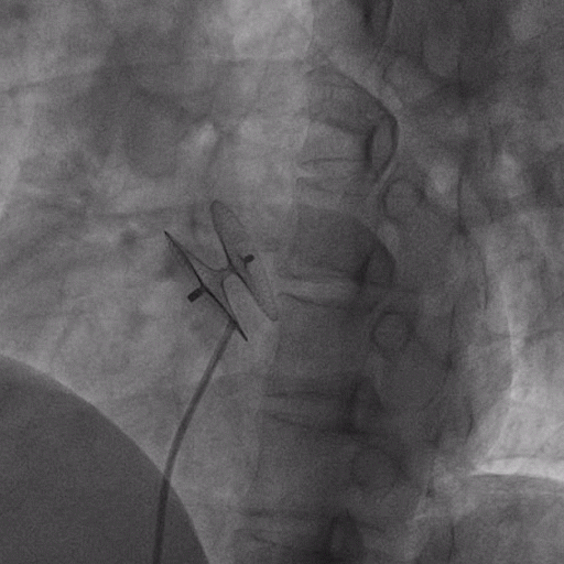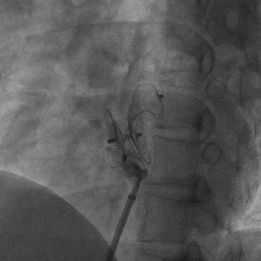 在獲得患者同意后,1月12日,尚福軍主任為患者進(jìn)行了PFO封堵術(shù)。術(shù)中造影可見封堵器殘余漏,尚福軍主任用精湛的技藝,順利通過封堵器殘余漏裂縫,將右心導(dǎo)管從右房送入左房,且順利到達(dá)肺靜脈;遂行卵圓孔未閉封堵術(shù)后殘余漏再次封堵;且完美釋放PFO封堵器,可見兩封堵器呈“馬蹄蓮”狀,再次術(shù)中造影未見殘余漏。