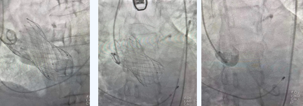 術(shù)中,曾廣偉主任團(tuán)隊高效配合,完成了特定時間點(diǎn)起搏心臟、臨時短時間關(guān)閉呼吸機(jī)、降低主動脈瓣阻力、快速釋放瓣膜等一系列高難度操作,有效保證瓣膜精準(zhǔn)釋放。瓣膜釋放經(jīng)TEE確認(rèn),主動脈瓣膜釋放位置佳,經(jīng)豬尾導(dǎo)管造影,主動脈瓣返流即刻消失,且無瓣周瘺。