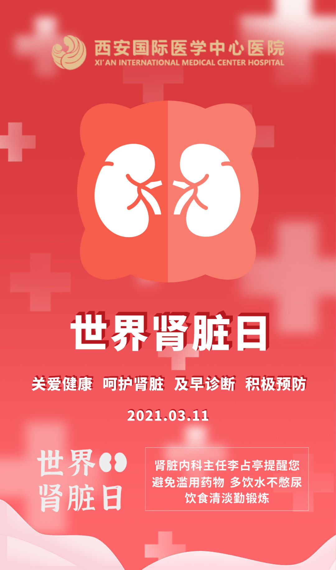 2021年3月11日是第16個世界腎臟日,今年的主題是“與腎病相伴,過健康人生”,西安國際醫(yī)學(xué)中心醫(yī)院腎臟內(nèi)科、兒童醫(yī)院分別舉辦義診活動,解答腎臟疾病防治的疑惑,幫助患者積極面對疾病,提高生活質(zhì)量。