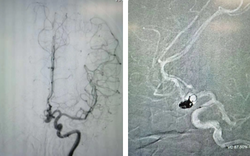腦血管較外周血管更為脆弱、迂曲,對(duì)術(shù)者的操作技術(shù)及精準(zhǔn)性要求特別高。術(shù)中,陸丹醫(yī)生通過(guò)股動(dòng)脈穿刺、置入微導(dǎo)管,再通過(guò)微導(dǎo)管將彈簧圏送入動(dòng)脈瘤腔內(nèi),利用彈簧圈的機(jī)械閉塞作用,達(dá)到防止動(dòng)脈瘤破裂的目的。術(shù)后,患者各項(xiàng)生命體征平穩(wěn)。