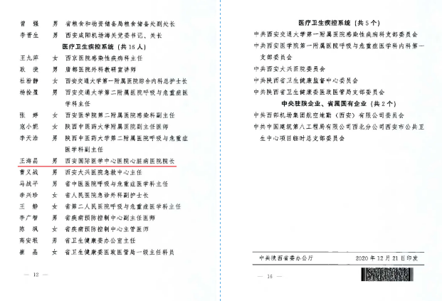 近期,中共陜西省委印發(fā)《關(guān)于表彰全省優(yōu)秀共產(chǎn)黨員和全省先進(jìn)基層黨組織的決定》,對在抗擊新冠肺炎疫情中涌現(xiàn)出來的134名優(yōu)秀共產(chǎn)黨員和45個先進(jìn)基層黨組織進(jìn)行了表彰。西安國際醫(yī)學(xué)中心醫(yī)院心臟病醫(yī)院院長王海昌被評為“陜西省優(yōu)秀共產(chǎn)黨員”。
