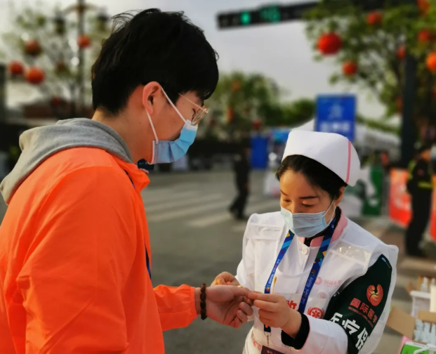 “醫(yī)生,我扭傷了腳踝,麻煩幫忙看看”,“護(hù)士,麻煩噴一些運(yùn)動(dòng)冰肌噴”……9點(diǎn)開始,奔跑大軍陸續(xù)抵達(dá),涂抹凡士林、提供糖鹽水、處理扭傷抽筋等醫(yī)療需求均得到回應(yīng),醫(yī)護(hù)人員各司其職,對(duì)運(yùn)動(dòng)員開展巡回指導(dǎo)和賽后恢復(fù)工作。