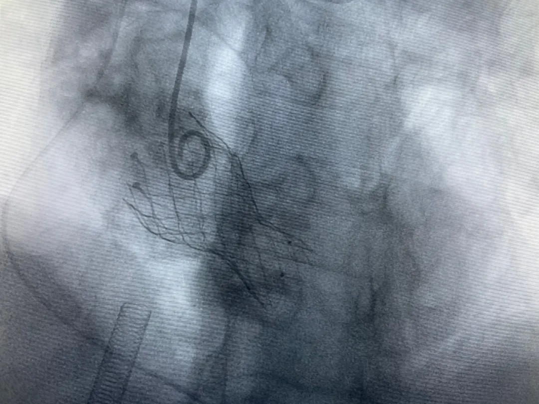 結(jié)合老人病情特點:年齡高、室壁厚、左室腔小、瓣膜鈣化嚴(yán)重,術(shù)中球囊擴(kuò)張和瓣膜釋放過程有循環(huán)崩潰可能;為降低此種風(fēng)險、最大程度提高手術(shù)成功率,張金洲副院長在術(shù)前組織了由楊金保博士帶領(lǐng)的TAVR團(tuán)隊多次反復(fù)溝通、討論,制定了各種應(yīng)急處理方案。最終經(jīng)過TAVR團(tuán)隊的默契配合,手術(shù)歷時2小時,用20#球囊預(yù)擴(kuò)張后順利植入23#主動脈瓣生物瓣膜,再次后擴(kuò)后主動脈根部造影顯示:人工主動脈瓣生物瓣位置良好,瓣葉開閉正常;冠脈顯影良好。經(jīng)食道超聲顯示:主動脈瓣葉活動度良好,主動脈跨瓣壓差約35mmHg,未見瓣周漏及明顯返流。出手術(shù)室前老人便已蘇醒,自訴憋悶癥狀完全消失。