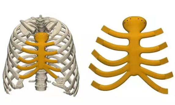 由于惡性腫瘤已經(jīng)侵蝕患者胸骨,且患者既往縱劈胸骨手術,手術中不得不行全胸骨切除置換,因此需要使用人工胸壁置換術。西安國際醫(yī)學中心醫(yī)院打破傳統(tǒng)植入方式,通過分析患者增強CT掃描資料,計算出腫瘤大小,切除范圍及切除后需要植入材料的大小形狀,并通過3D打印技術制作出和患者解剖結構完全相同的植入材料,植入物采用國際上先進的聚醚醚酮(PEEK)材料,其力學結構接近人體皮質骨,具有重塑胸壁力學的顯著特性。由此來制作人工胸廓替代胸骨和部分肋骨。