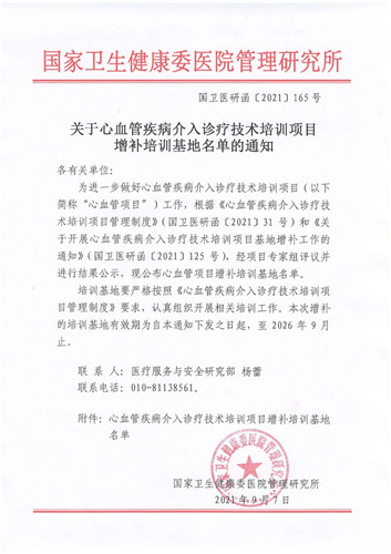 9月7日,在國家衛(wèi)生健康委醫(yī)院管理研究所發(fā)布的《關(guān)于心血管疾病介入診療技術(shù)培訓項目增補培訓基地名單的通知》中,西安國際醫(yī)學中心醫(yī)院榜上有名,這標志著我院已成功躋身于國家級心血管疾病介入診療醫(yī)療機構(gòu)行列,同時也標志著我院成為陜西省冠心病介入培訓基地之一,肩負心血管介入醫(yī)師的規(guī)范化培訓的使命,造福更多的心血管疾病患者。