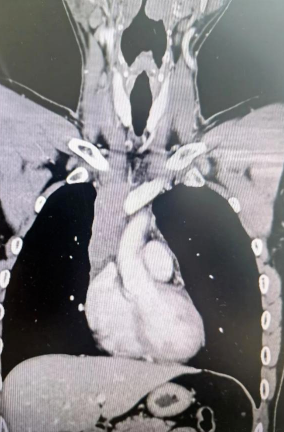 經(jīng)檢查發(fā)現(xiàn)患者前上縱隔腫瘤已經(jīng)完全侵犯了我們?nèi)梭w最主要的大靜脈之一——上腔靜脈,導(dǎo)致上腔靜脈回流嚴(yán)重受阻并導(dǎo)致由上腔靜脈起至左側(cè)無(wú)名靜脈、右側(cè)鎖骨下靜脈、右側(cè)頸內(nèi)靜脈等多根自上往下回流的靜脈阻塞,從而形成了廣泛的栓子,牢牢堵住了要流回心臟的血流,只能靠別的一些側(cè)支循環(huán)超負(fù)荷的工作,這也就是為什么孫先生脖子甚至是頭都明顯腫起來(lái)的原因。
