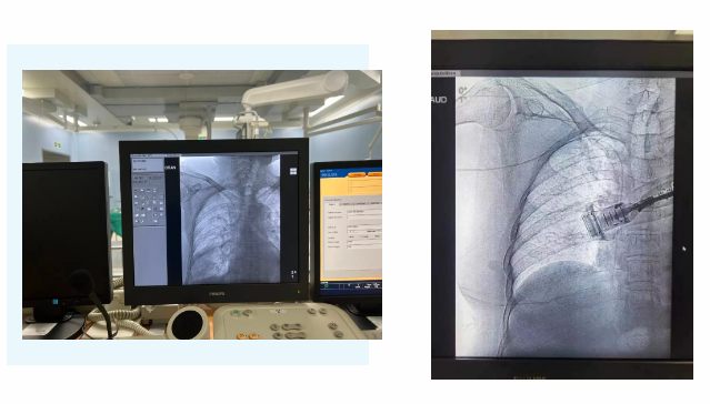 在麻醉手術(shù)中心的配合下,手術(shù)首先由韓海靜護(hù)士長(zhǎng)在超聲引導(dǎo)下應(yīng)用“塞丁格”法穿刺將針尖一樣細(xì)的導(dǎo)絲送入血管,術(shù)中在DSA透視下將導(dǎo)管沿著血管送達(dá)上腔靜脈,尖端精準(zhǔn)定位至上腔靜脈開(kāi)口處。隨后,胸腔外科支亞男主治醫(yī)師在穿刺點(diǎn)下方取2厘米小切口內(nèi)進(jìn)行上臂港囊袋和隧道的制作及導(dǎo)管與港座連接,最后進(jìn)行港體埋植及皮內(nèi)縫合,使患者切口隱蔽美觀創(chuàng)傷小,術(shù)中出血量極少。手術(shù)在X片影像留影,最終手術(shù)順利完成。