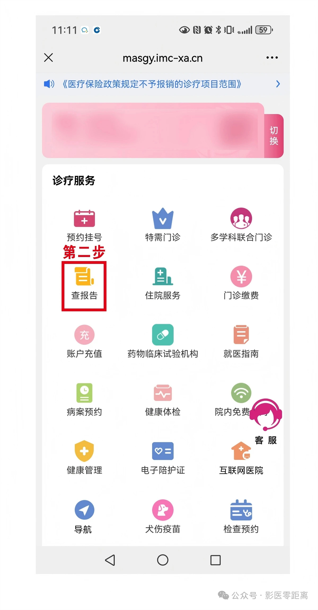 第一步:在醫(yī)院微信公眾號首頁,點擊底部菜單欄左側(cè)的【診療服務(wù)】入口